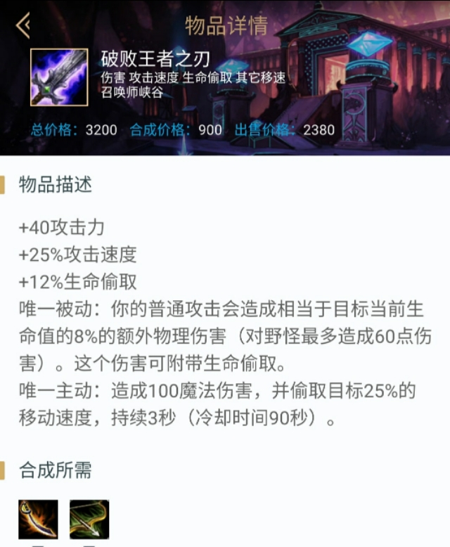破败王者之刃是一件非常强大的装备,可以增加攻击力、生命值和攻击速度,同时还可以减少敌人的移动速度和攻击力。