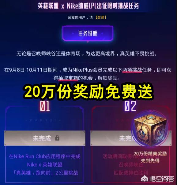 这个活动是一种全新的活动类型,相对于以前需要在召唤师峡谷奋战数夜,才可以参与获取奖励的活动而言,这一次的活动明显要简单多了。首先大家需要知道,这次活动是lpl与赞助商联合推出的限时挑战任务,所以,除了单调的靠局数这种要求以外,他还需要在赞助商的链接中完成任务。虽然说有点繁琐,但是大家可以放心,这次活动皮肤质量还不错,没有图标与表情之类的敷衍奖励,唯一较差的就是有可能拿到已有的皮肤,另外,欧皇小伙伴更有可能获得运动衫与运动鞋实物奖励。
