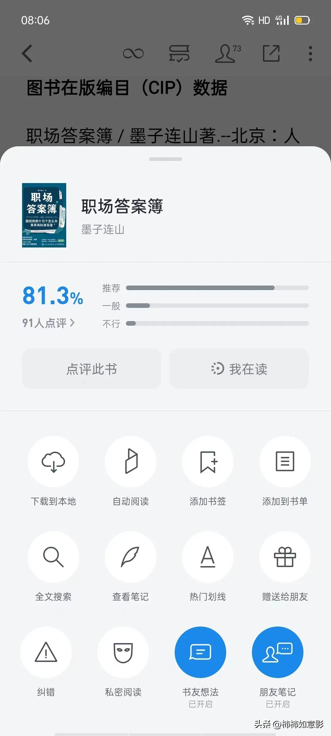 3、每本书的扉页可以看到哪些朋友在读,书友对于本书的看法和书友对于文章中精彩的部分做的阐述。