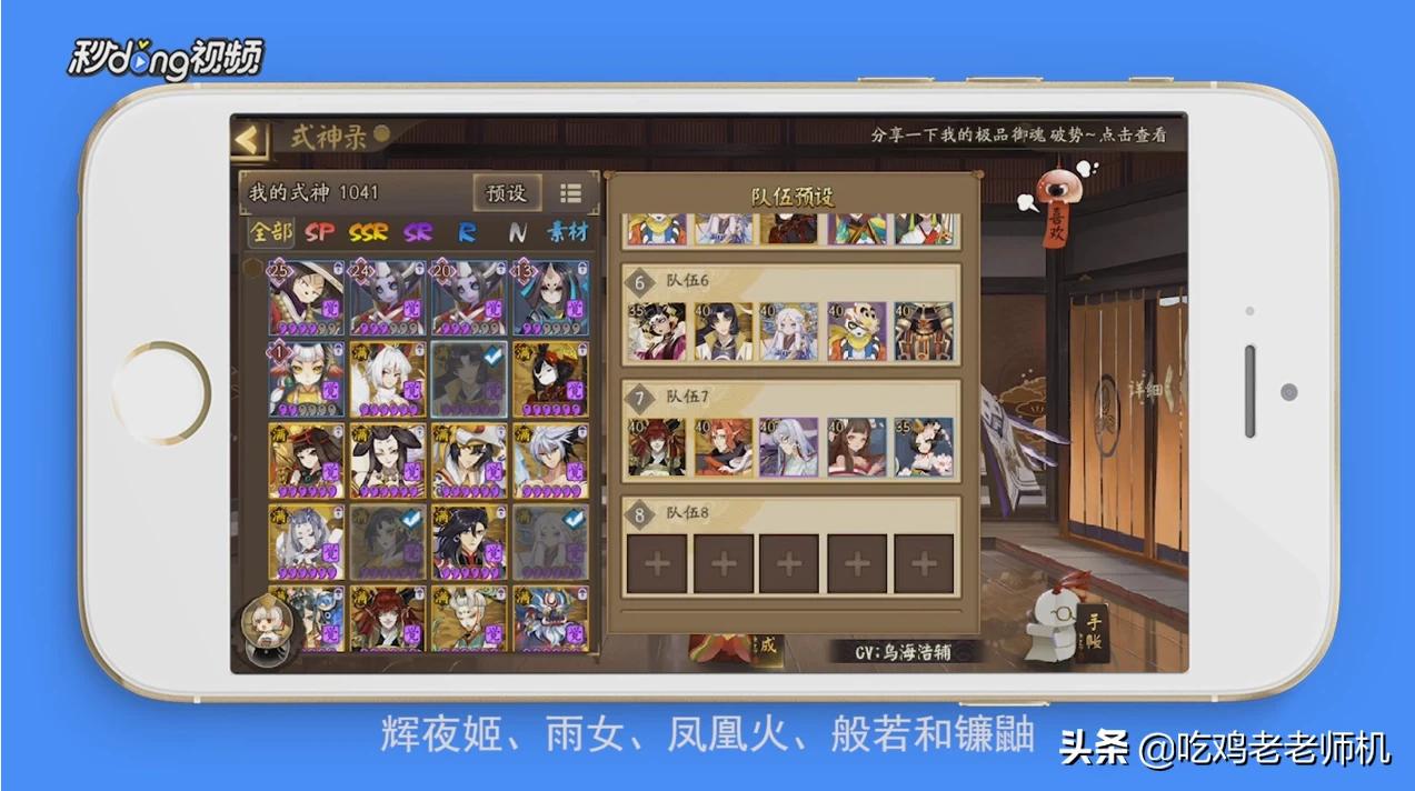 兔子,座敷(追月),姑姑(主c)+又一个c,桃花或者樱花妖(奶),r的莹草也行还可以打c,奕也可以打c不过比较难抽到。