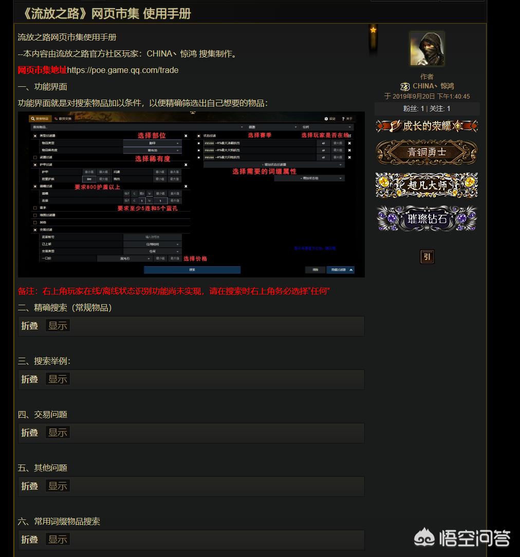 由于游戏里面的道具极多,游戏还给玩家提供了专用的集市网页(不收费),这个网页将玩家仓库的标记售卖道具放到网站上供买家细节检索,然后玩家自己沟通交易。