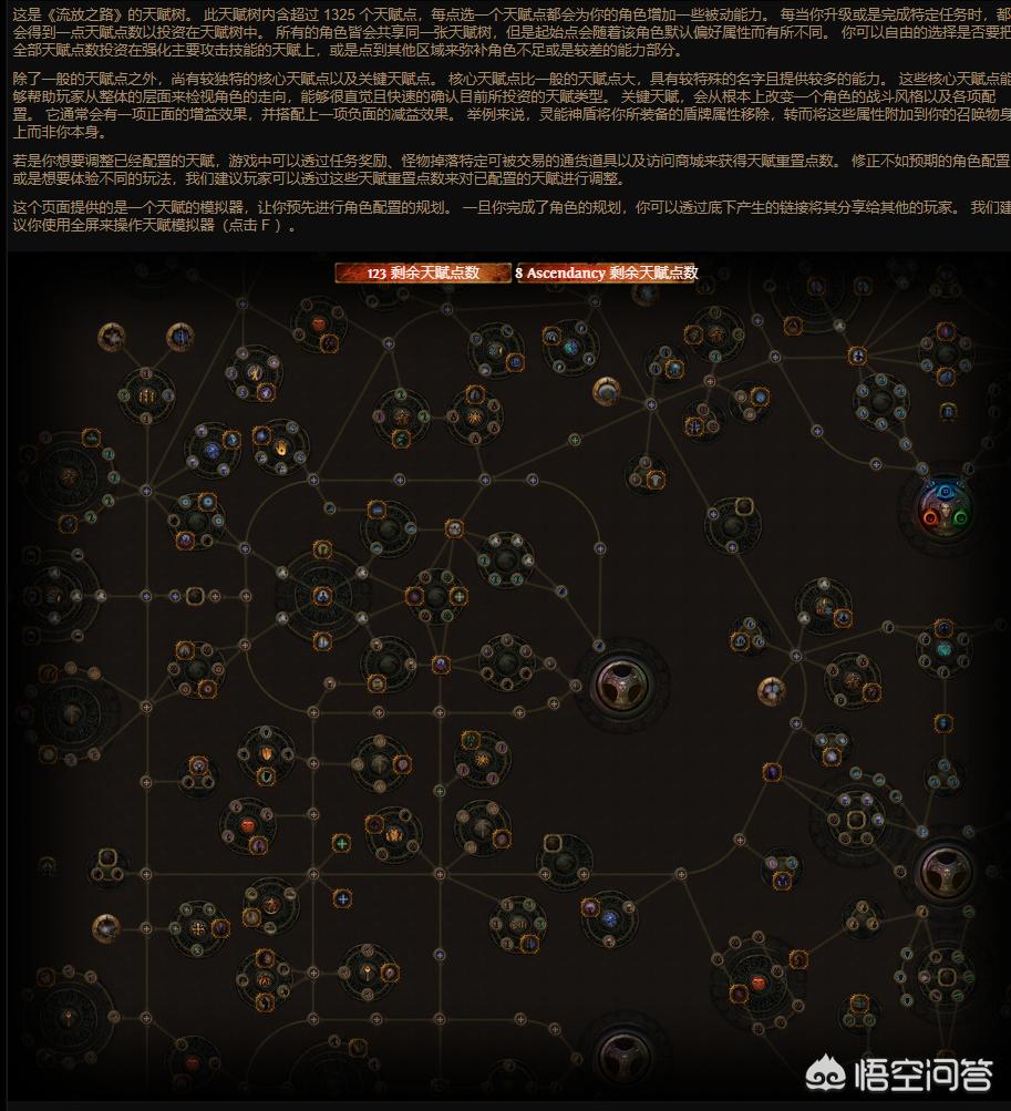 这是《流放之路》的天赋树。 此天赋树内含超过 1325 个天赋点,每点选一个天赋点都会为你的角色增加一些被动能力。 每当你升级或是完成特定任务时,都会得到一点天赋点数以投资在天赋树中。 所有的角色皆会共享同一张天赋树,但是起始点会随着该角色默认偏好属性而有所不同。 你可以自由的选择是否要把全部天赋点数投资在强化主要攻击技能的天赋上,或是点到其他区域来弥补角色不足或是较差的能力部分。