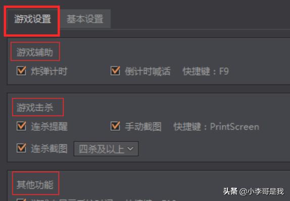 3、在游戏设置里,可以设置“游戏辅助”、“游戏击杀”、“其他功能”等设置。