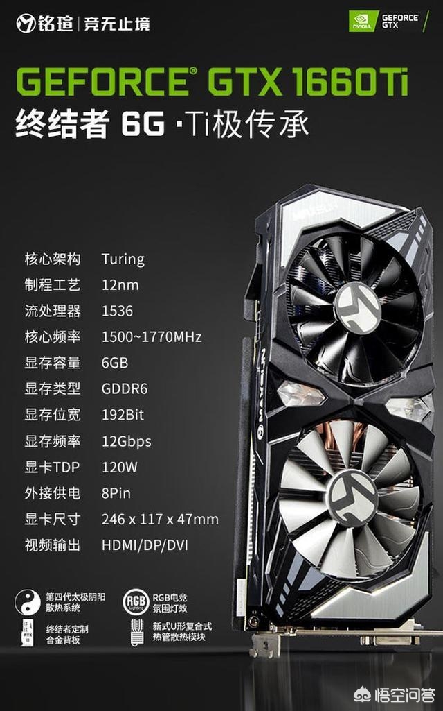 GeForce GTX1660Ti显卡,规格:GTX 1660Ti采用TU116核心,基于12nm制程,拥有1536个流处理器,核心频率1500MHz(Boost:1770MHz),显存方面则是搭配6G/192位的GDDR6显存,频率为12Gbps。