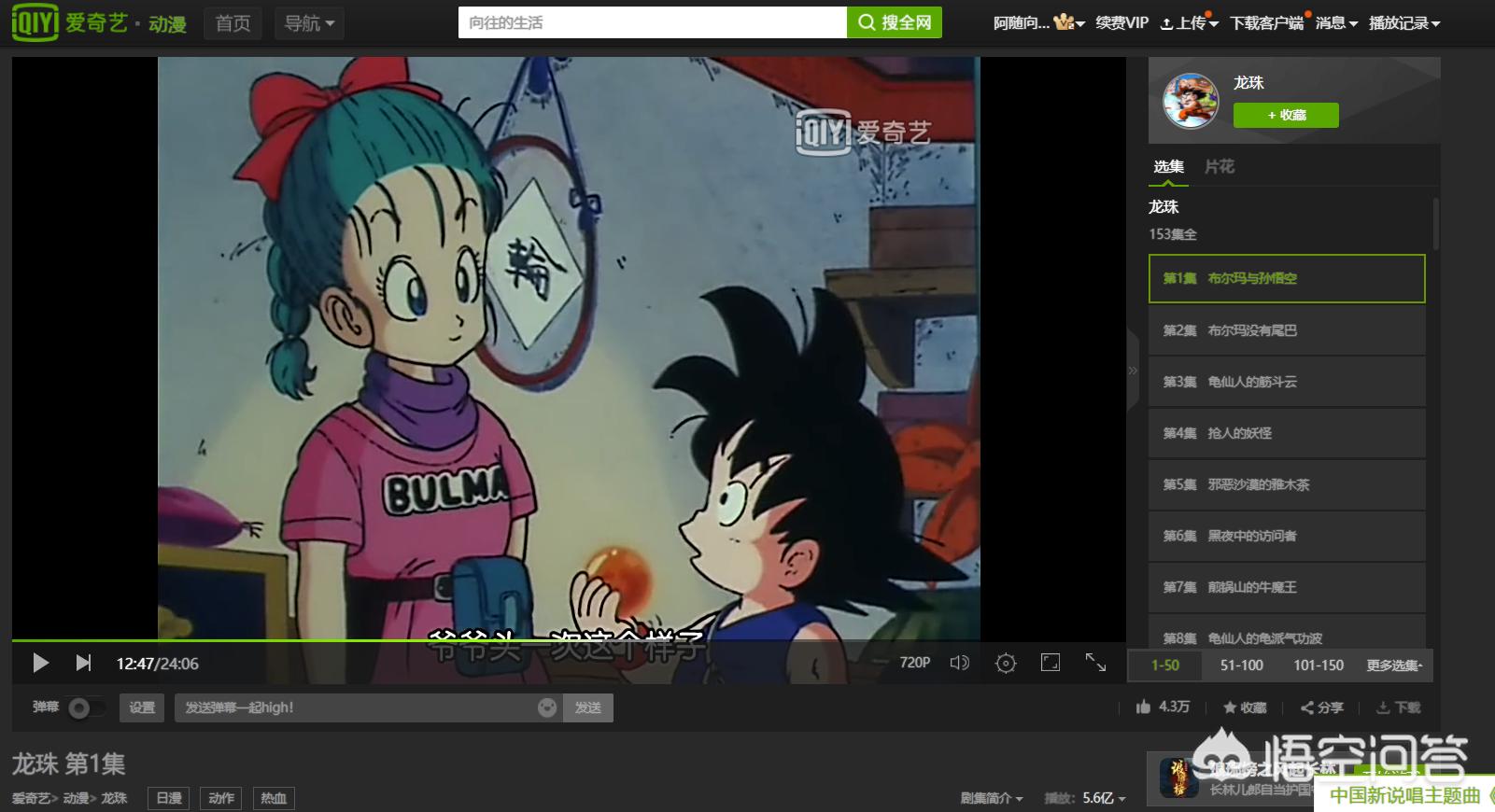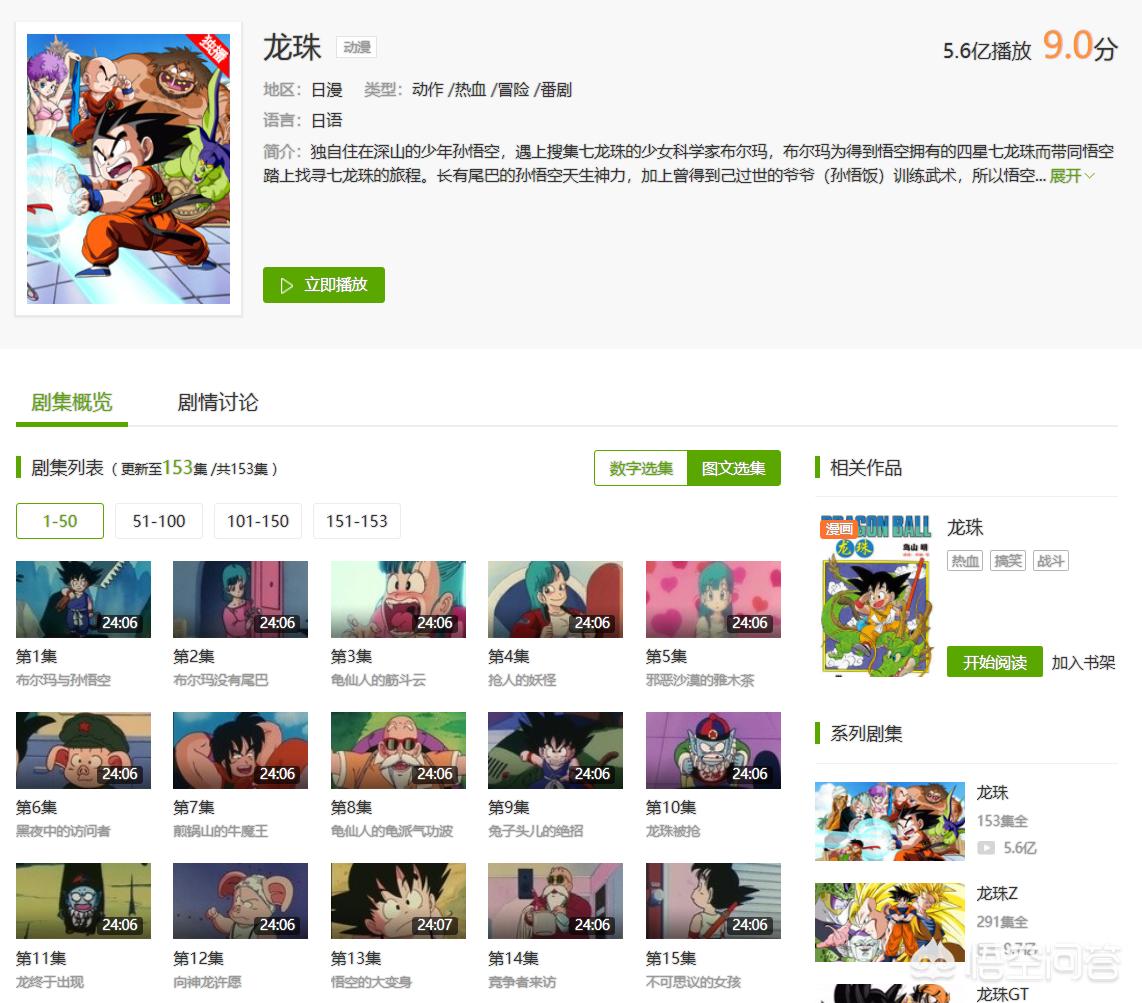 我们从搜索结果页面点击《龙珠》,即可进入到它的主页面,这里有作品的基本介绍,剧情播放列表及集标题,可以按顺序观看,也可以通过标题来选择想补看的特定集,可以说是非常方便了。而且还可以在这里边看边讨论,目前在爱奇艺上,《龙珠》第一部已经获得了5.6亿播放量,以及9.0的超高分。