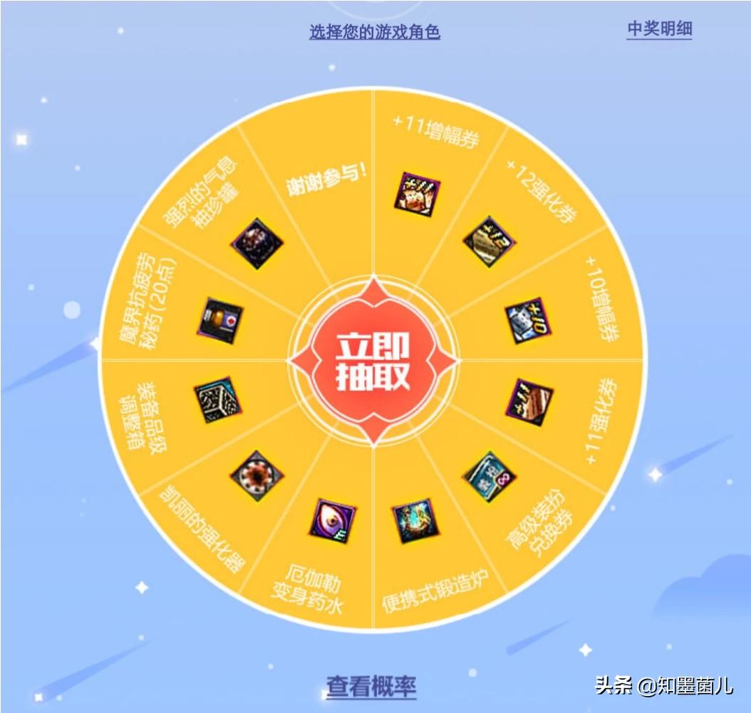 目前奖品池里有:11增幅劵、12强化劵、10增幅劵、11强化劵、高级时装兑换劵*1、便携式锻造炉*1、厄伽勒变身药剂、凯丽的强化器*1、装备品级调整箱*1、PL药(20点)*1、强烈的气息袖珍罐*1、谢谢参与!
