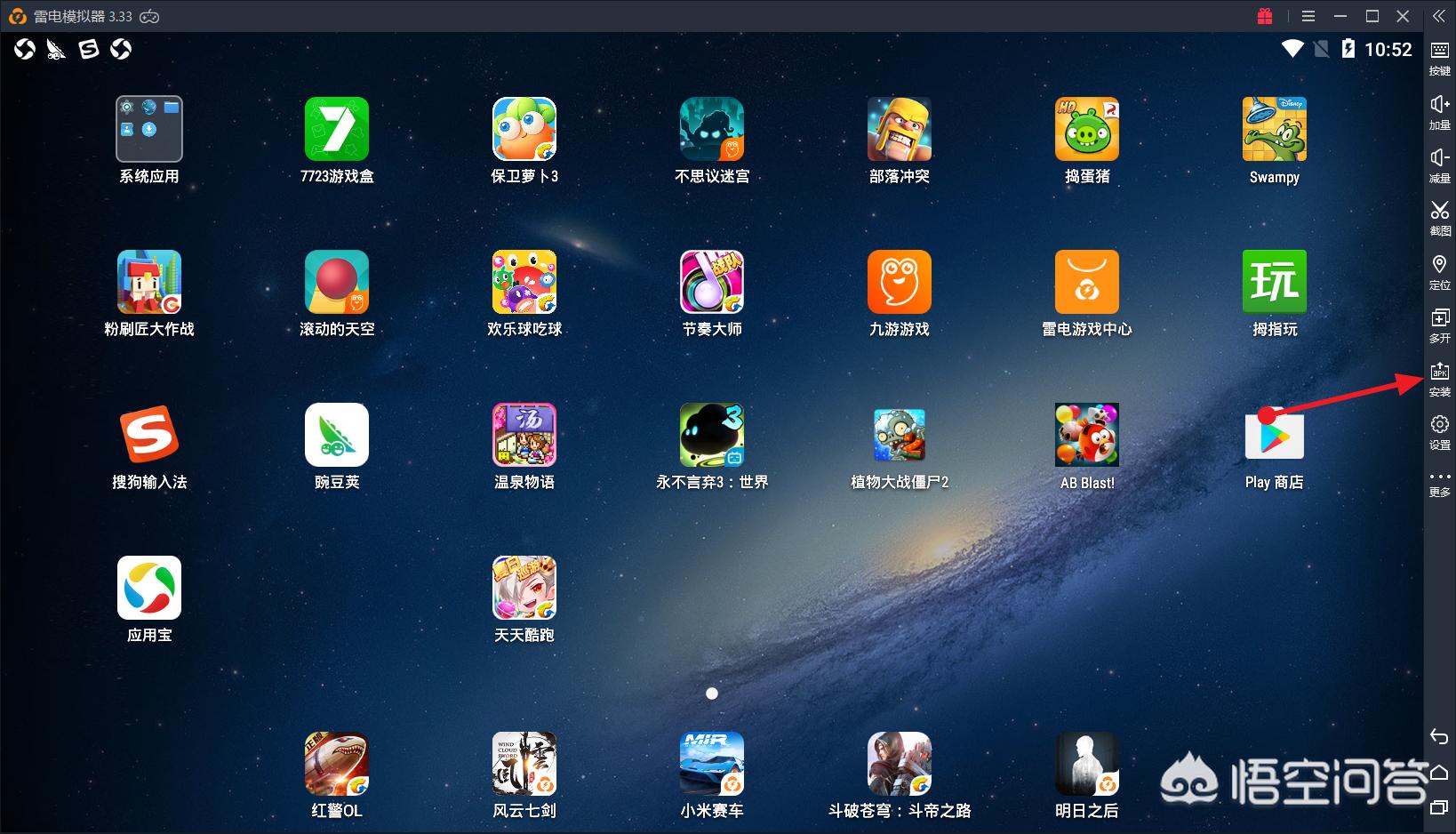 当然其他模拟器也可以,如雷电模拟器、海马玩模拟器、夜神模拟器等等,方法也是大同小异;比如说,在雷电模拟器的右面功能栏上有安装apk的按钮