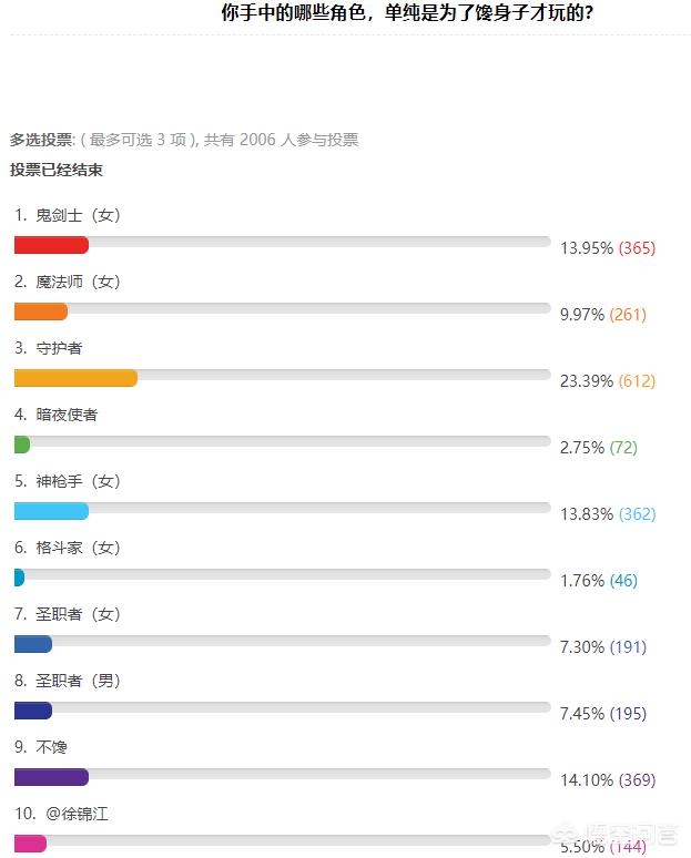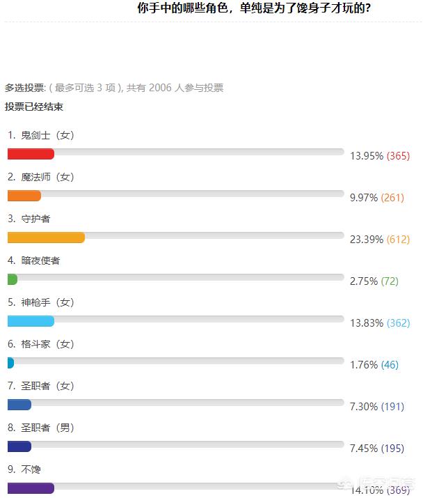 在本次投票中总共有2006人参与,其中守护者投票排名第一占23.39%,不馋身子的排名第二占14.10%,排名第三的则是女鬼占13.95%,而作为女格斗居然排名倒数第一只占1.76%,这确实让人感到有些意外。
