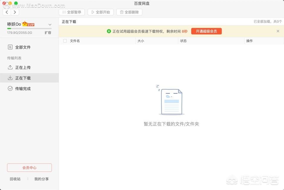 网盘下载限速?那你有没有试过Mac百度网盘本地VIP无限使用版?直接安装即可使用,登录账号显示为SVIP,下载资源时点击试用加速,时间永远剩8秒,即无限使用,如遇不正常情况,关闭重新打开即可。
