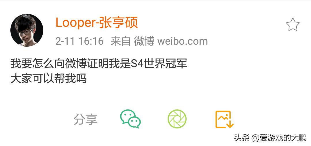 要说英雄联盟最高荣誉,那当然是S赛冠军,S赛冠军是所有职业选手职业生涯中渴望得到的荣誉,并且S赛荣誉还可以认证,像大家熟悉的选手The shy微博有S8全球总冠军认证,Doinb和Tian微博有S9全球总冠军认证,只要是拿到大赛冠军都可以在微博上认证。2月11日下午,Looper向粉丝们求助如何向微博证明是S4世界冠军。