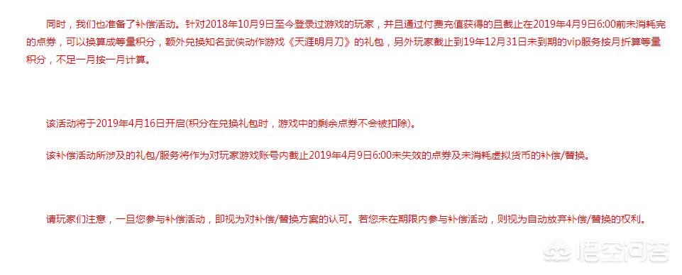 官方补偿公告:玩家通过付费充值获得的,最早于2018年10月9日登录过游戏至今,截止到2019年4月9日6:00之前未消耗完的点券,可以兑换成等量的积分,在网游《天涯明月刀》中实现通用,可额外兑换武侠动作游戏《天涯明月刀》游戏礼包。