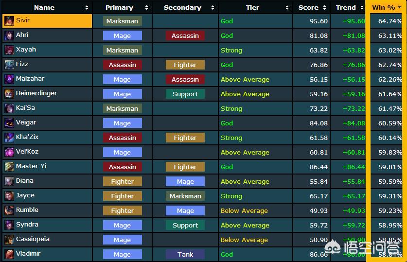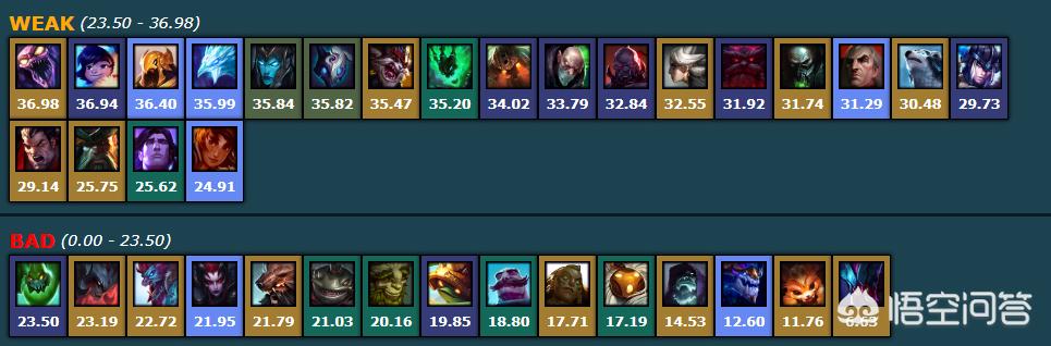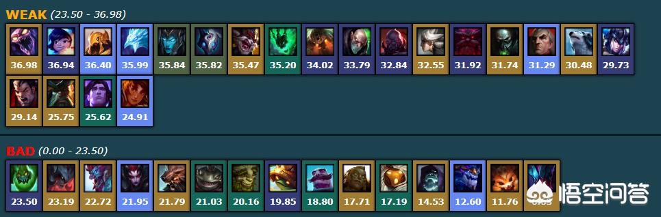 最差的就是几个处于垫底水平的英雄了,尤其是雷克赛,6.63%的胜率已经可以用惨不忍睹的来形容了,基本是选了必输的状态,主要是雷克赛的技能真的不吃Buff,就连翠神的胜利都比他高很多。