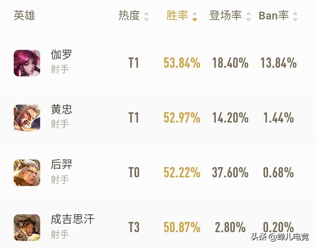伽罗的太华皮肤上线没两天也是直接把伽罗的胜率达到了射手榜第一,胜率高达53.89%,登场率高达16.2%,ban率共是高达13.16%,伽罗这个英雄在后期是非常无解的,只要队友在前排保护的好,真的是想杀谁就杀谁。唯一缺点就是前期太弱,在钻石星耀局最受欢迎!