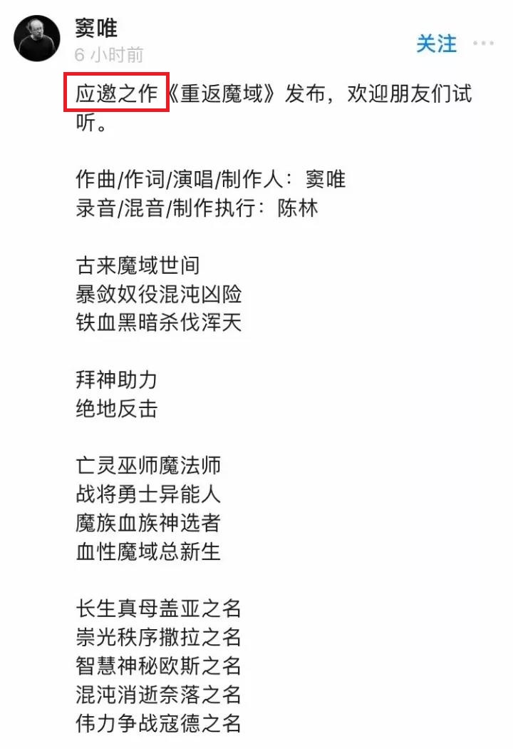 这个“战歌”就是窦唯受邀请参加创作的《魔域手游》作品了。