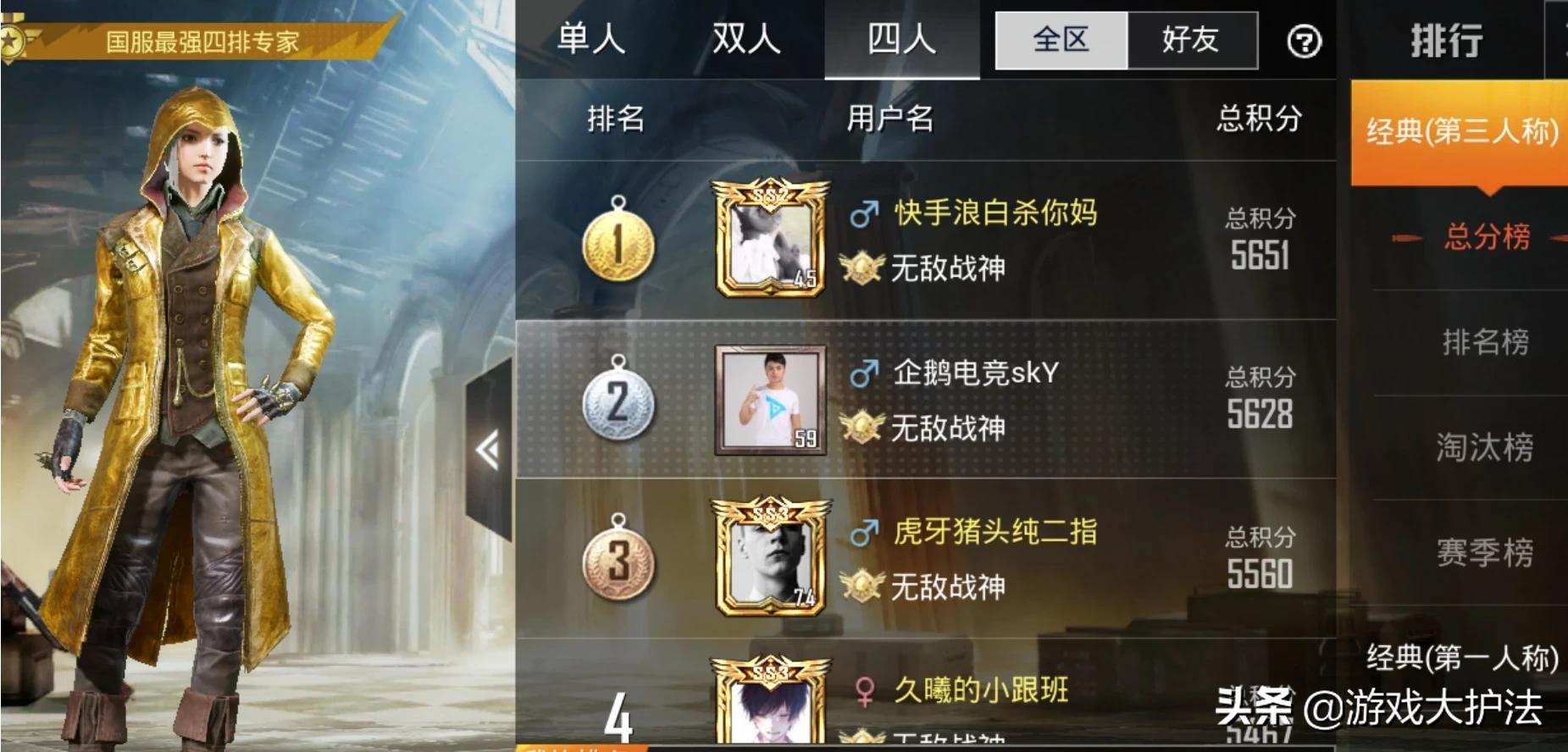 我们先来看一下两个大区之间的实力有哪些差别,QQ区四人排行榜中第一名的玩家段位积分是5651分,第100名最低分是4819分,也就说说全区前一百分的分数区间是4819-5651。
