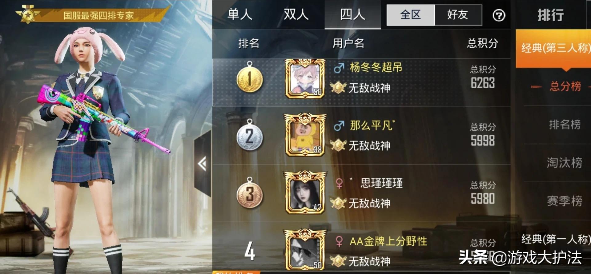 我们同样看一下微信区的四人排行榜分数,第一名最高分是6263分,第100名最低分是5112分,不过微信区战神榜第一名这名玩家有点厉害,第二名玩家直接就变成了5998分,依照两大区的排名竞争情况来看,微信区略胜一筹,总体玩家技术比QQ区能高那么一丢丢,但这只是体现了高段的水平,按照游戏君的实战情况来了解,其实QQ区的铂金-皇冠的玩家实力比较强。
