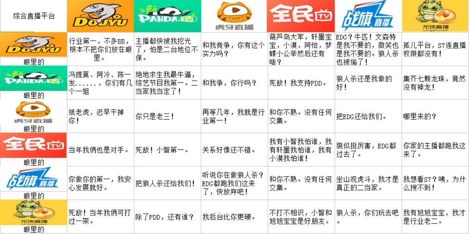 看到的这个图还是蛮有意思的,基本能够概括几个游戏平台的特点了,现在游戏类型的直播平台,基本就关注斗鱼、熊猫、虎牙多一些,斗鱼的弹幕比较骚,但是画质一般,听说为了上市降低码率什么的,个人也不太懂;熊猫TV画质清晰,但弹幕没有斗鱼有趣,有些梗比较旧