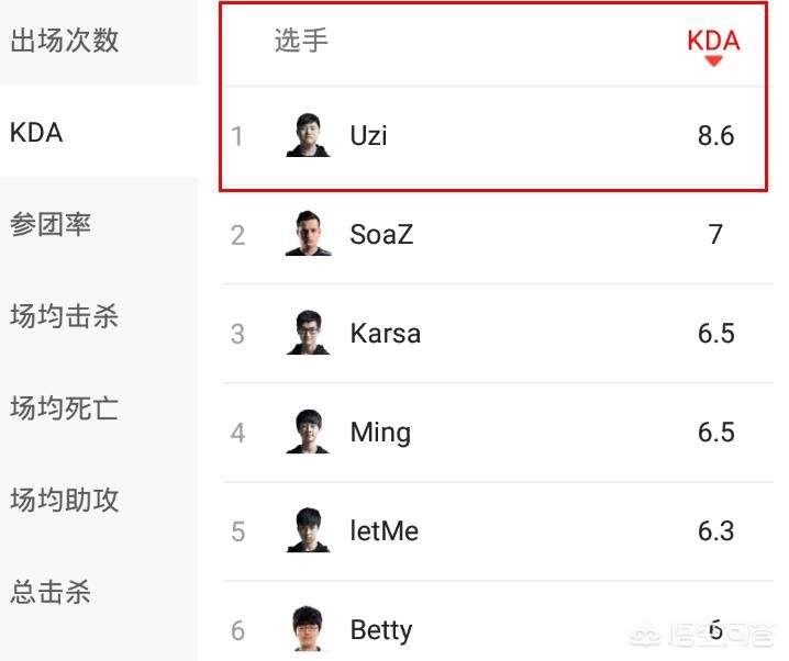 KDA,UZI第一,说明UZI伤害助攻都很高,但是死亡却很少。MSI上,UZI每场几乎都杀疯了,对线输出,团战输出,自己还不死,如果这个ADC的个人实力不行,那么能有这么高的KDA吗?