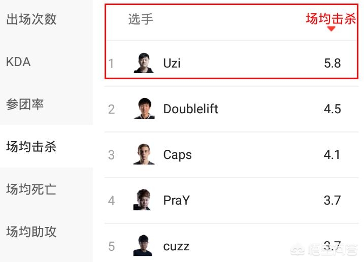 场均击杀最高,平均5.8个人头。直接和其他选手拉开了差距,足以说明UZI在团队中的贡献了。