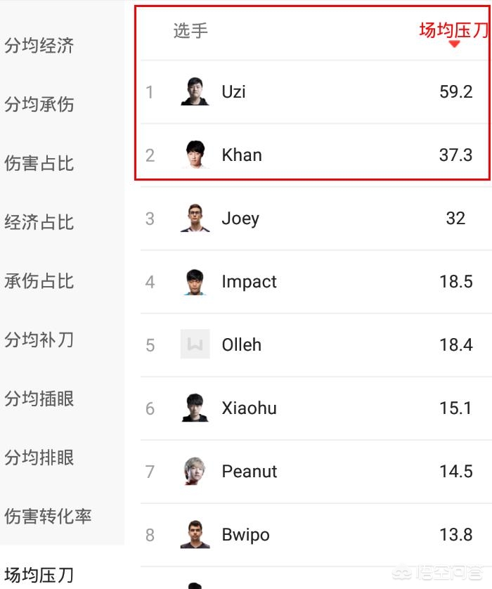 场均压刀....这个体现了UZI的个人能力,压刀能领先这么多,自然说明了对位上占据优势。很多人说UZI是因为吃三路线的原因,那么如果你看了下一条数据,就明白了。