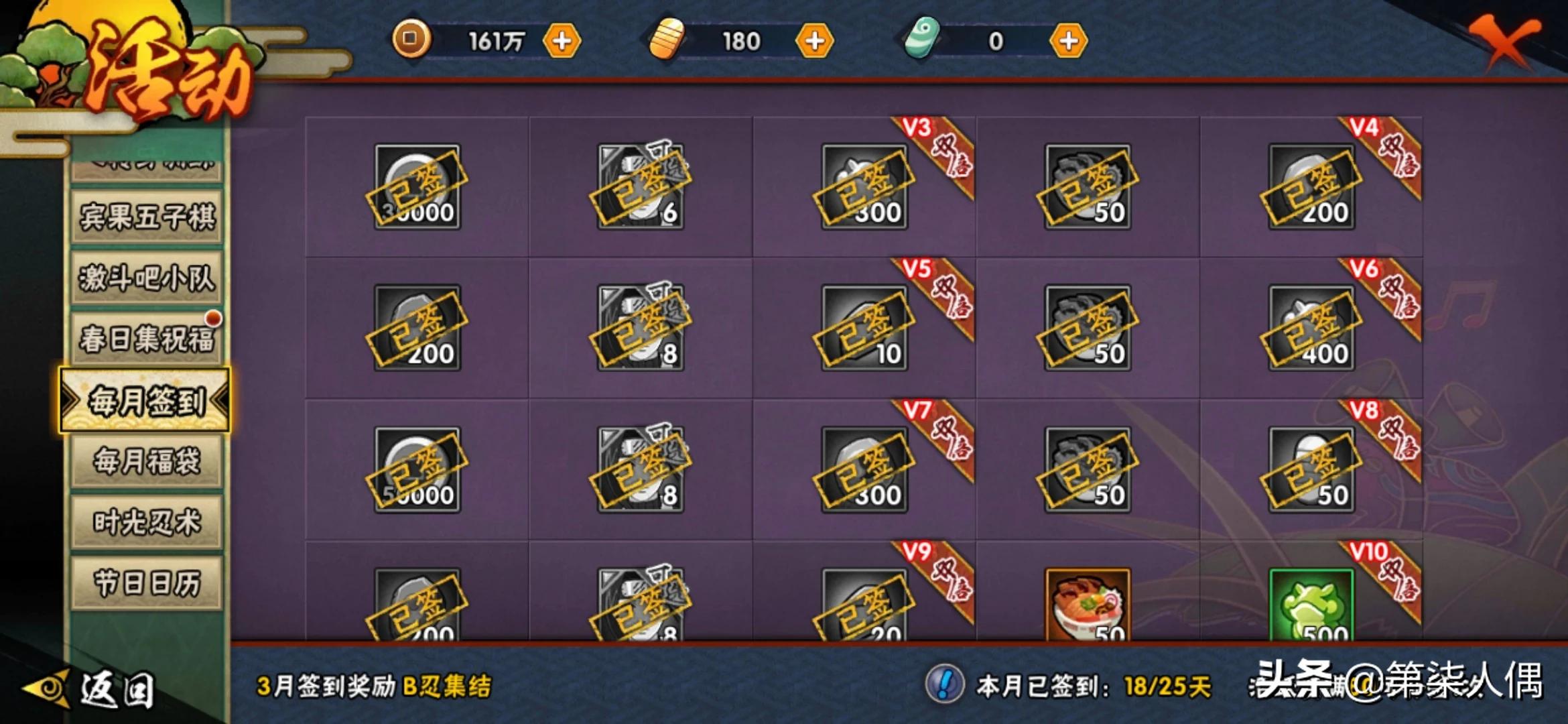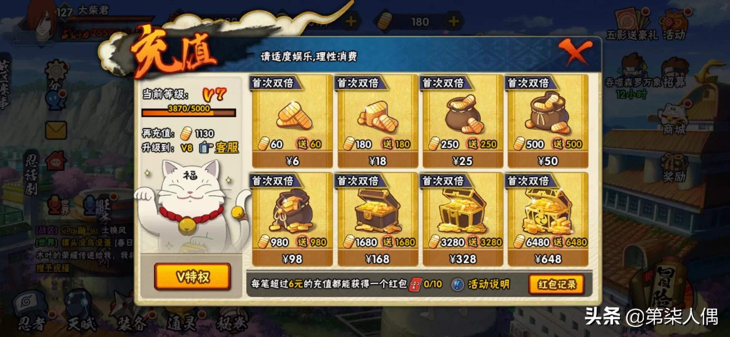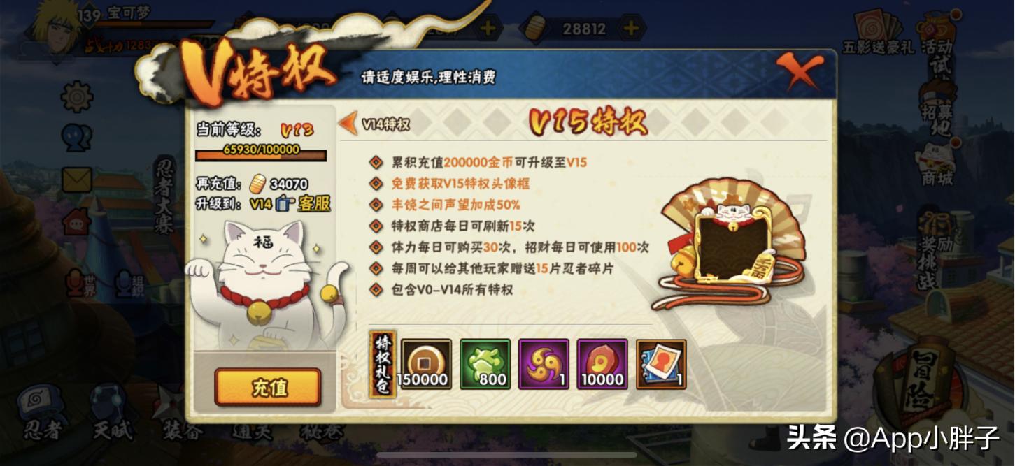 所以,我也顺便提醒各位,火影忍者手游只要保持一定的活跃度,月卡玩家就可以非常舒服,虽然比不上一些氪金大佬,但至少能够保持主流的忍者阵容和战力标准,这也是大多数玩家选择的方式,而V特权就如我前面所说,尽量弱化他的存在,除非你是为了开启限定招募、特权商店等有目的性质的氪金,不然的话,还是像我一样随缘提升V等级比较实在。
