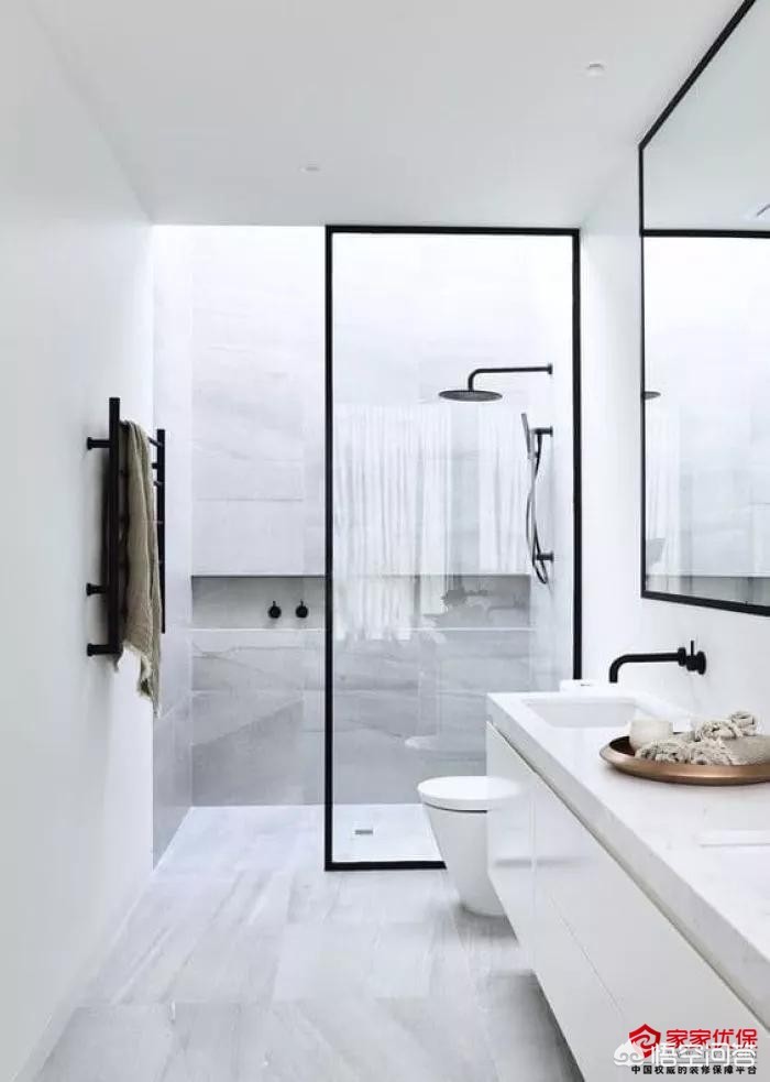 面积相对大的卫生间,建议采用实体墙完全隔离,整个卫生间看起来更有空间感,墙面上可以做一些收纳柜。