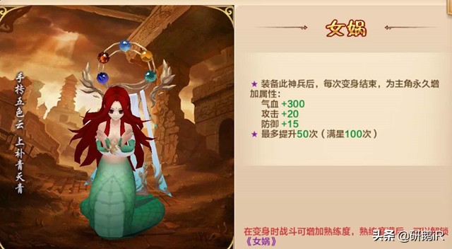 天蛇仗的技能是【女娲】可以为主角永久附加属性:气血300、攻击20、防御15、最多提升100次。最多可以提供30000气血,2000攻击,1500防御。这些属性对于后期来说,微不足道,所以单看神兵的技能,并不是很实用。而其他技能,在PVP和PVE活动中,也没有明显的优势。
