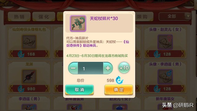 我们再来看看神兵的价格,目前唯一的购买渠道是龙魂币商城598元,这个价格是很高的了,以往的神兵价格都在188左右,而此次天蛇仗的价格竟然是其他神兵的3倍之多。