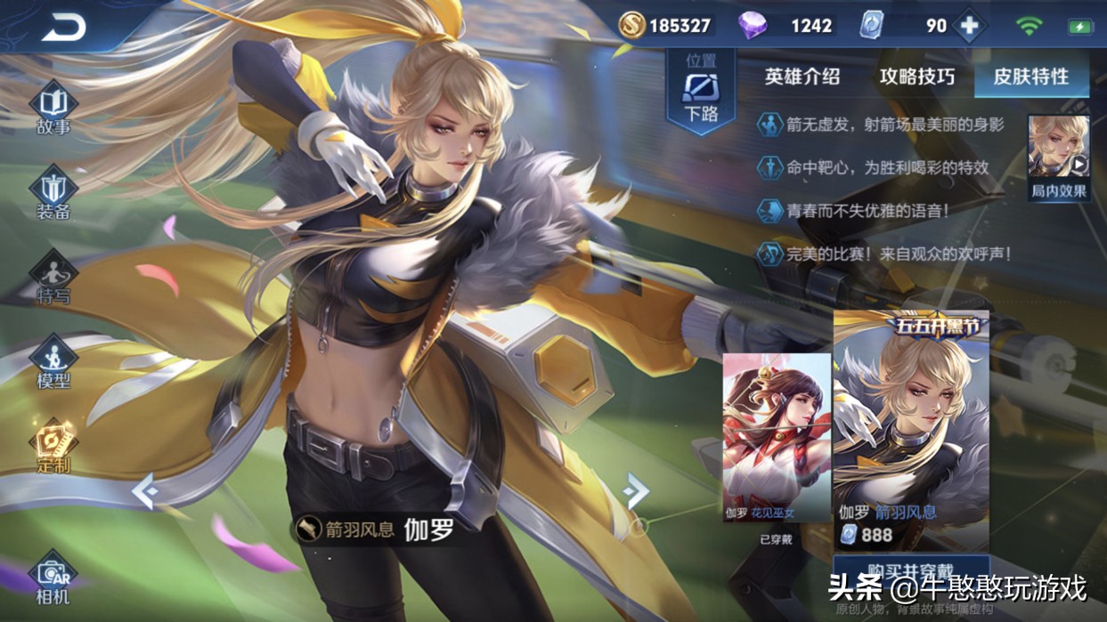伽罗的这款皮肤在之前的选手的时候是收费皮肤,穿黑丝。结果现在貌似改为免费获取的皮肤,黑丝改为皮裤了,瞬间觉得索然无味,有木有。。