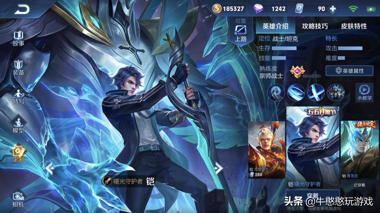 当初这个皮肤上架就已经入手了,用的第一感觉就是人形态的凯看着很普通没什么特别,但是在战斗中的特效是完全对得起这个价格的。最重要的是这个皮肤特殊的打击感,比起后来的青龙志好太多。说回英雄,凯已经称霸了几个赛季官方认证的单挑王不是盖的。而且操作难度不大,有回复有格挡状态好一打二不是问题,所以入手皮肤首先推荐曙光守护者!