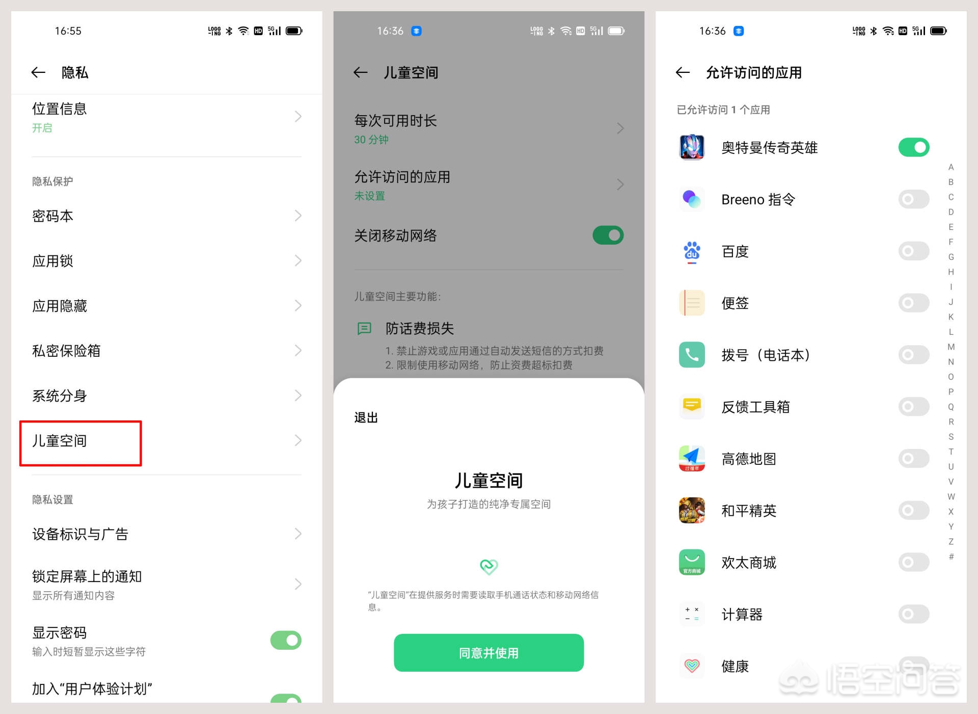 OPPO手机设置——安全页面下,其实隐藏了很多具有保护价值的小功能,比如“儿童空间”,就是针对熊孩子的,设置该模式后,小孩只能在使用我们限定的APP,其它应用自动“隐身”,这一招简单粗暴,既能让孩子满足玩手机的需求,同时也隐藏了我们想要保护的APP。