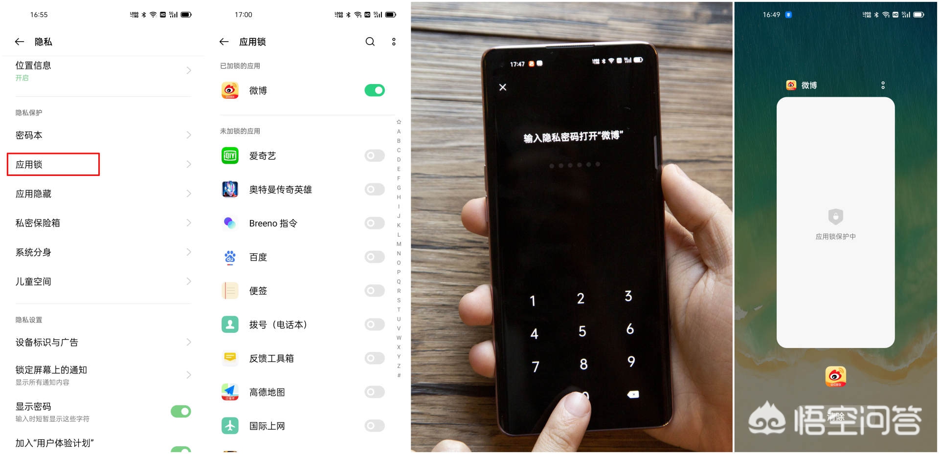 OPPO手机还支持了“应用锁”、“应用隐身”功能,同样是在设置——安全页面下能找到,想要保护哪款APP,加锁、隐身一键搞定,用起来很方便,也很实用。