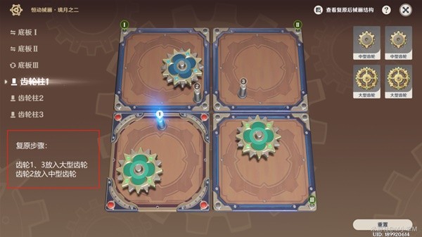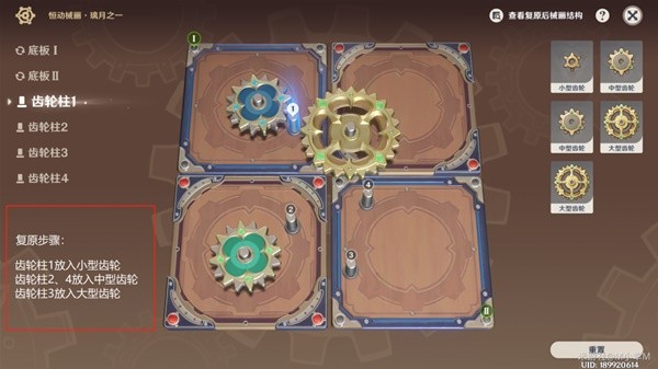 第三步:点击齿轮柱1放入小型齿轮,齿轮柱2、4放入中型齿轮,齿轮柱3放入大型齿轮