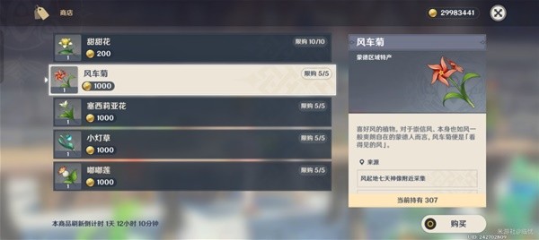 蒙德芙萝拉【「花语」店主】(出现时间为06:00-19:00)可购买5株风车菊: