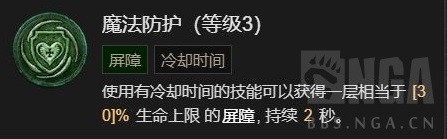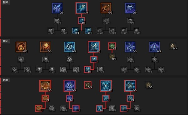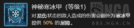 技能树里面传送术、冰霜新星、火盾、寒冰碎片全部点满,整套核心围绕魔法防护这个技能,3个防御技能都可以提供屏障,屏障联动增伤。