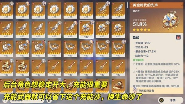 带充能武器乍一看面板不佳,实则在输出时间拉长后,创造的循环价值可以拉近与纯输出类武器的差距。尤其是哪些准备单水芙宁娜配队的玩家,带专武大概率需要配充能沙,若为充能武器则可以考虑生命沙。真要论有效词条,雾切、裁叶之类也不比两把充能武器强,说是平替,实则强度不错好吧~