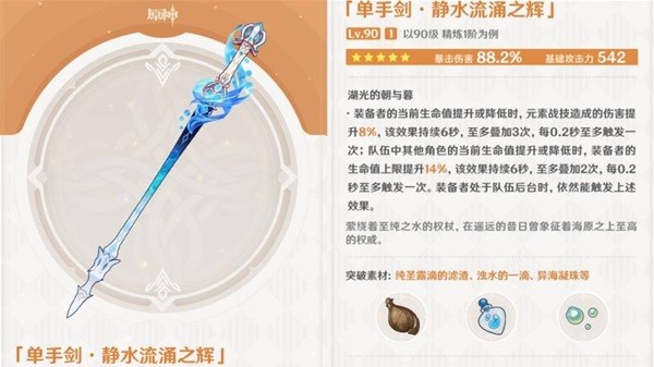与芙宁娜一同UP的5星限定单手剑——静水流涌之辉。凭借高达88.2%暴击伤害,搭配542低攻击白值,可以说绝大部分的单手剑角色都可以使用!无论你是吃攻击、防御、精通还是生命,此武器都能带来价值拉满的暴伤词条~