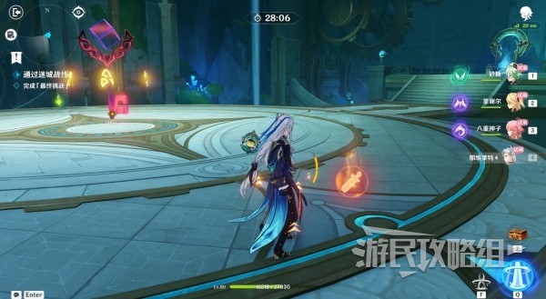 如果全部使用自己的角色并且练度较高的话,可以直接开始最终挑战。如果直接打最终挑战有些困难的话,就先把三个符文挑战打完再打最终挑战,与场上的蓝色传送门互动可以快速传送到符文挑战场地。期间场上会出现增益效果球,可以在挑战时或开始挑战前拾取。