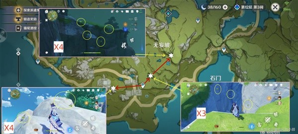 ▶跑前准备:配队双风角色,减少体力消耗;队伍中有纳西妲和七七是最优的,纳西妲可隔空采集(琉璃袋生长环境在悬崖石壁),七七可显示璃月区域特产(琉璃袋生长较分散且均为单个生长);