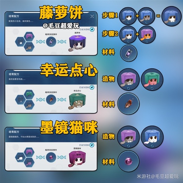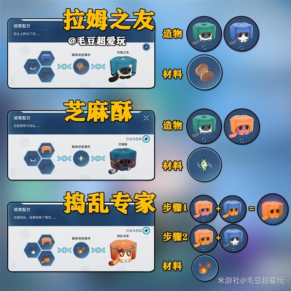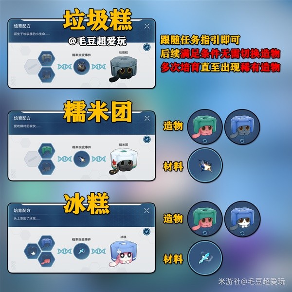 下图为毛豆整理的稀有造物培育攻略,只需要按照图上的造物选取即可,没有出现稀有造物也无需更改,多次培育直至出现稀有造物。