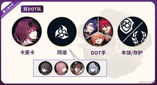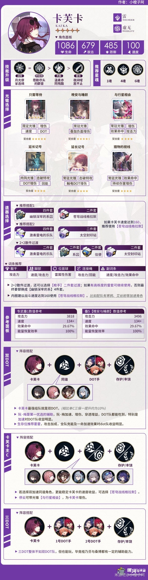 因此,卡芙卡现在的配队主要分为两种,一个是卡芙卡dot流,搭配桑博或者卢卡一起打dot输出。另一个就是卡芙卡主C队,配合一些虚无或者同谐辅助,依靠卡芙卡自身打伤害。