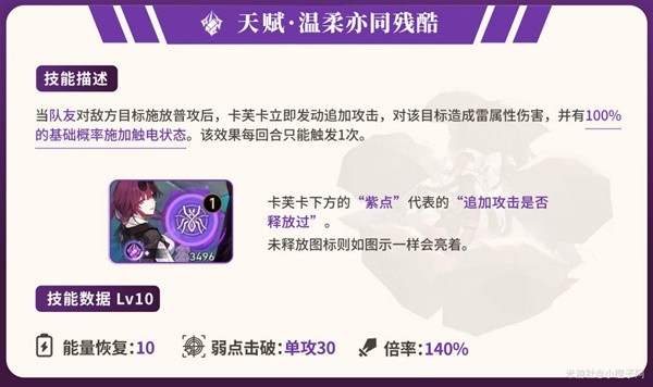 ③追加攻击恢复10点基础能量,相当于基本每回合都可以恢复10点基础能量,加快卡芙卡终结技释放频率。