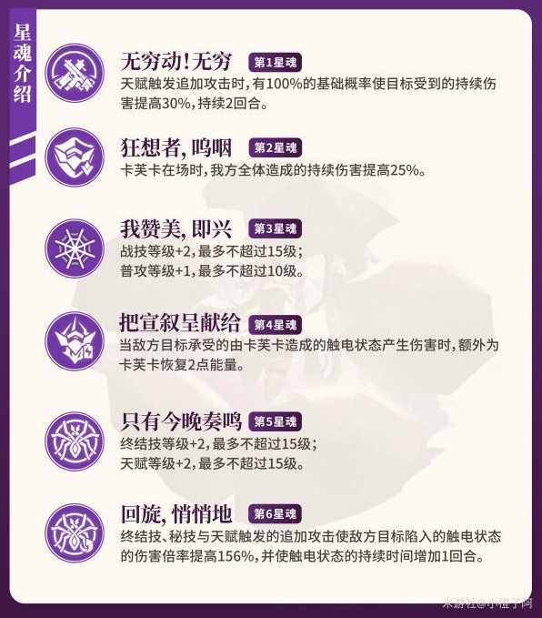 整体来看,卡芙卡是个星魂战士,星魂里全是数值,拥有稳定伤害提升,没有什么影响手感和体验的机制。
