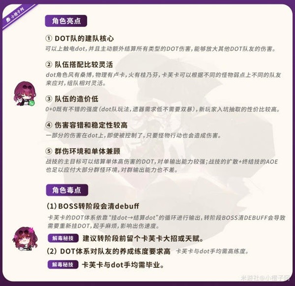 由于卡芙卡身上带着较多的DOT接口,玩家可能会认为卡芙卡不带DOT体系队友就玩不了,但实则不然,卡芙卡自身上DOT的能力很强,在三保一阵容下也能有较好的表现,属于不带DOT队友也能打,带了DOT队友更强。