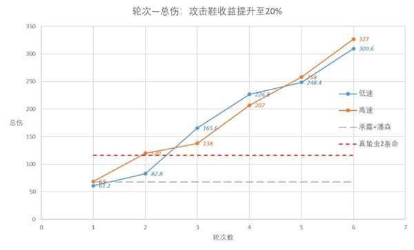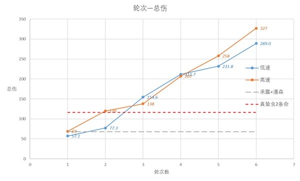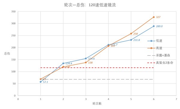 特意为2轮总伤准备的120速有立竿见影的效果,一转颓势。但在当前假设下,120速低速镜流虽然没有劣势,但也没有优势,因为不管低速高速都只能打1T。此时,低速的绝对优势区间主要在120~154w之间。