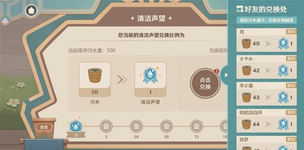 tip:污水兑换清洁声望的比例决定了最终完成全奖励解锁的效率,可以借用好友的小铺来兑换。(回归玩家的小铺兑换效率会更高哦~)
