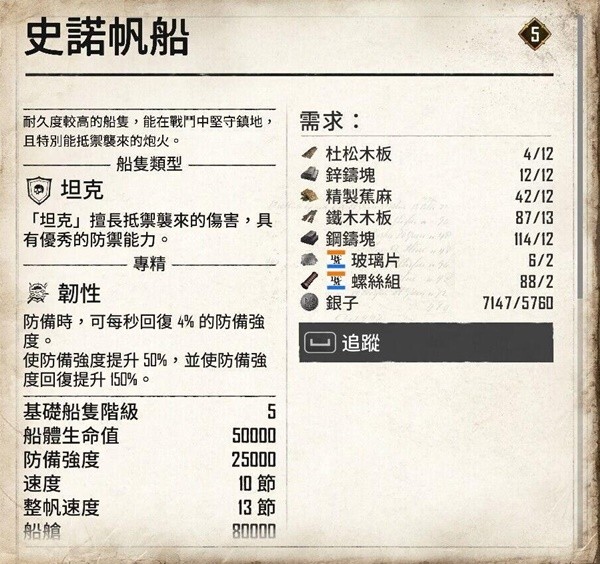 第二艘是单纯的肉盾船,防御性极强,建议于后期组队打BOSS活动时使用,这船个人建议必须人手一艘,所以建议板友们第一艘入手船尽量选择航速18节的恒帆双桅船。