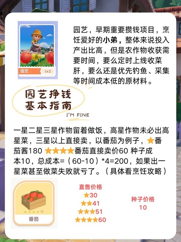 《心动小镇》园艺赚钱玩法攻略 2024-07-30 11:31:52 大中小 《心动小镇》是一款玩法多样且自由的建造、种田加养成的休闲游戏,那么在游戏中要如何赚钱呢?下面请看由“比较胖的猪肚鸡”带来的《心动小镇》园艺赚钱玩法攻略,希望对大家有用。 全文查看