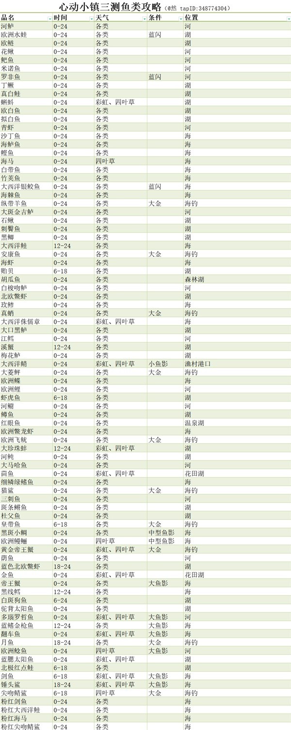《心动小镇》中玩家们可以通过钓鱼来获得不同的鱼,那么游戏中各种鱼的出没时间是什么时候呢,下面请看“小然然”带来的《心动小镇》各鱼类出没时间及位置一览,希望能够帮助大家。