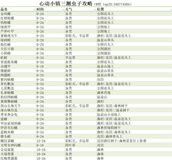 《心动小镇》地图中分布着各种昆虫,那么这些虫子的都在什么地点和时间刷新呢,下面请看“乔治治”带来的《心动小镇》昆虫出没时间及位置一览,希望能够提供帮助。